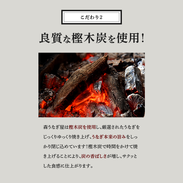 良質の樫木炭を使い、国産の厳選されたウナギをじっくり焼き上げ、外はサクッと、中はふんわり仕上げております。