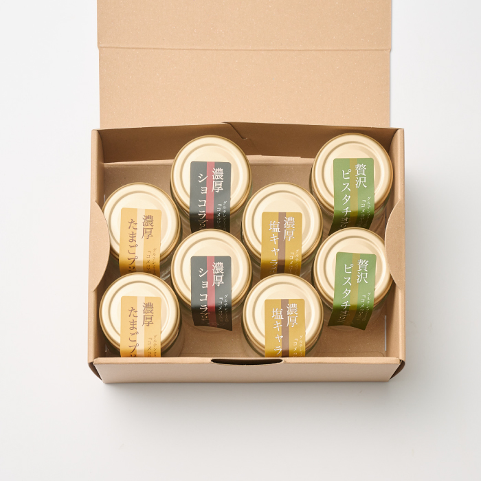 80g x8個(濃厚たまごプリン×2個、濃厚ショコラプリン×2個、贅沢ピスタチオプリン×2個、濃厚塩キャラメルプリン×2個)