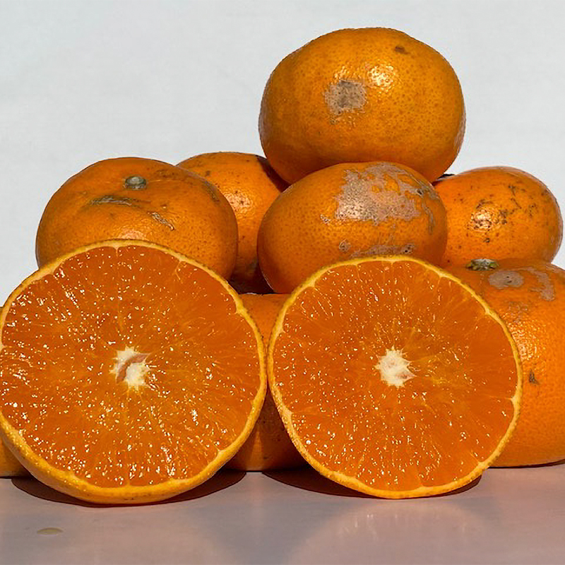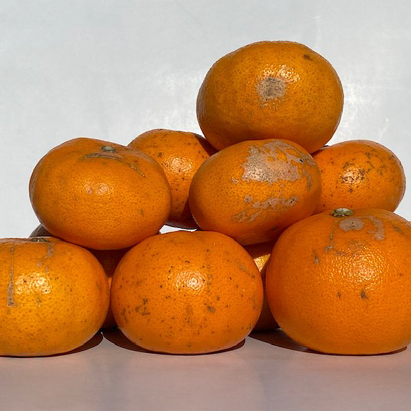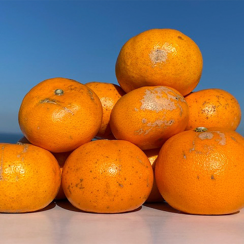 みかんの果皮に白い粉のようなものが付着している場合がございますが、これは果皮を乾燥させ輸送中の傷みを和らげるカルシウム剤ですので食べても何の問題もございません。