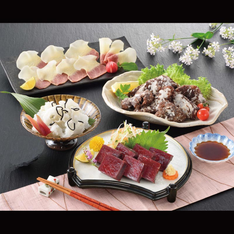 | 内容量 | 鯨竜田揚げ150g、鯨赤身肉(刺身用)100g、鯨おばいけ100g、鯨ベーコンスライス50g |