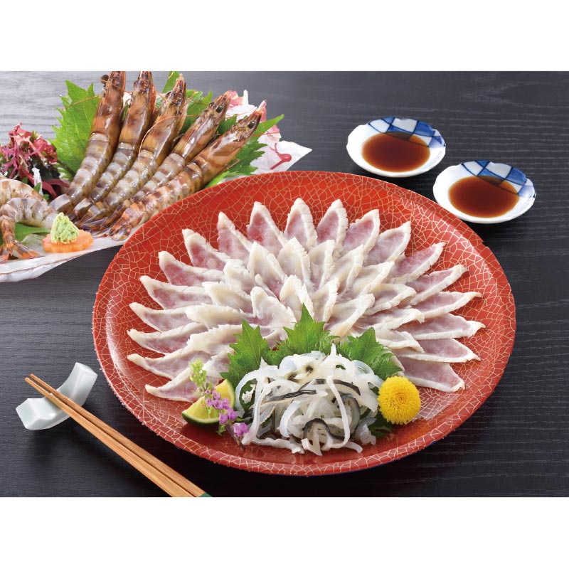| 内容量 | 真ふぐ霜降り刺身(25cm皿)70g、とらふぐ皮30g、車海老(刺身用)200g、ふくポン酢10g×3、もみじおろし10g×3 |