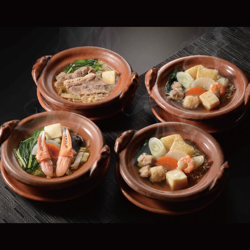 | 原材料 | ●寄せ鍋:白菜(国産)、鶏肉(ブラジル)、豆腐、清酒、みりん、醤油、白葱、鶏つくね、えのき、ニラ、大根、人参、ボイルむきえび、油揚げ、魚介だし/凝固剤、調味料(アミノ酸等)、リン酸塩(Na、K)、酸味料●牛鍋:白菜(国産)、牛肉(国産)、みりん、清酒、醤油、えのき、青葱、佐藤、豆腐、魚介だし/加工デンプン、凝固剤●蟹鍋:白菜(国産)、紅ずわいがに爪(国産)、清酒、みりん、豆腐、しいたけ、醤油、青葱、大根、人参、魚介だし/凝固剤 |