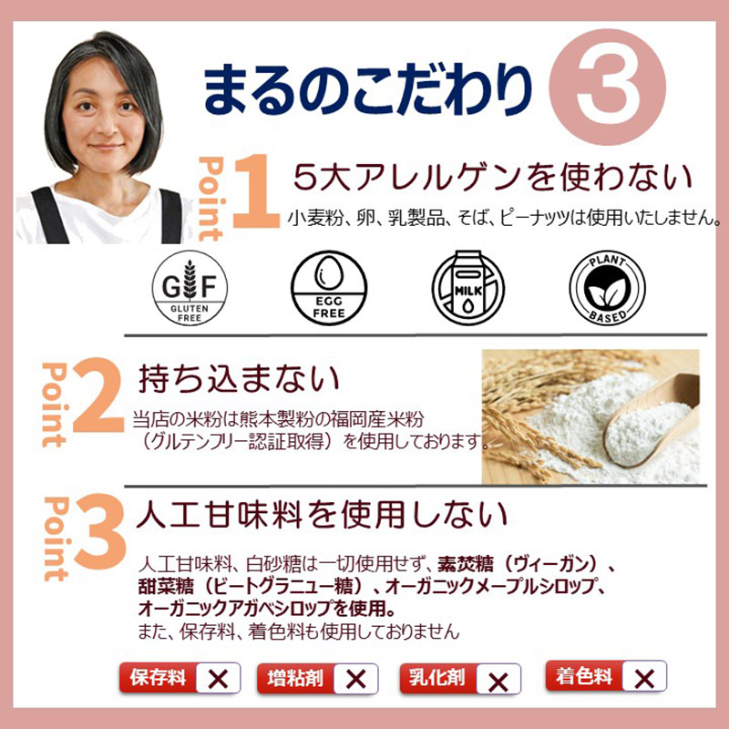 | 原材料 | 米粉(福岡産)、片栗粉、素焚糖(ヴィーガン)、なたね油(平田産業)、サイリウム(オオバコ)、ドライイースト、食塩(またいちの塩) |