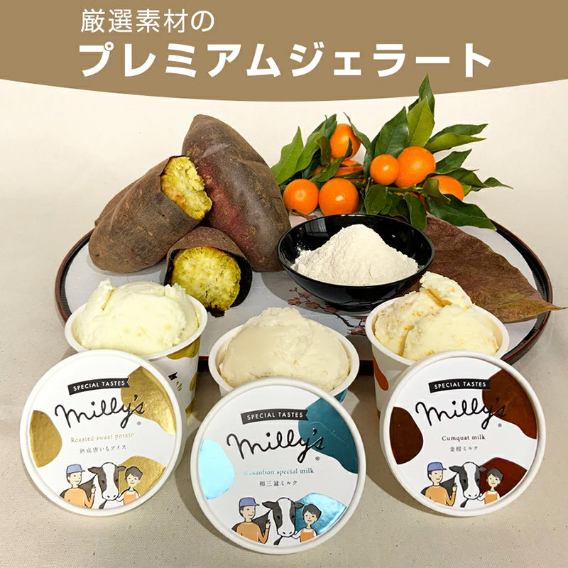 | 内容量 | プレミアム ミリーズ:金柑ミルク、和三盆ミルク、熟成唐いも(各110ml×1個)