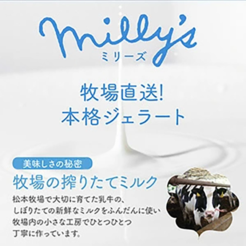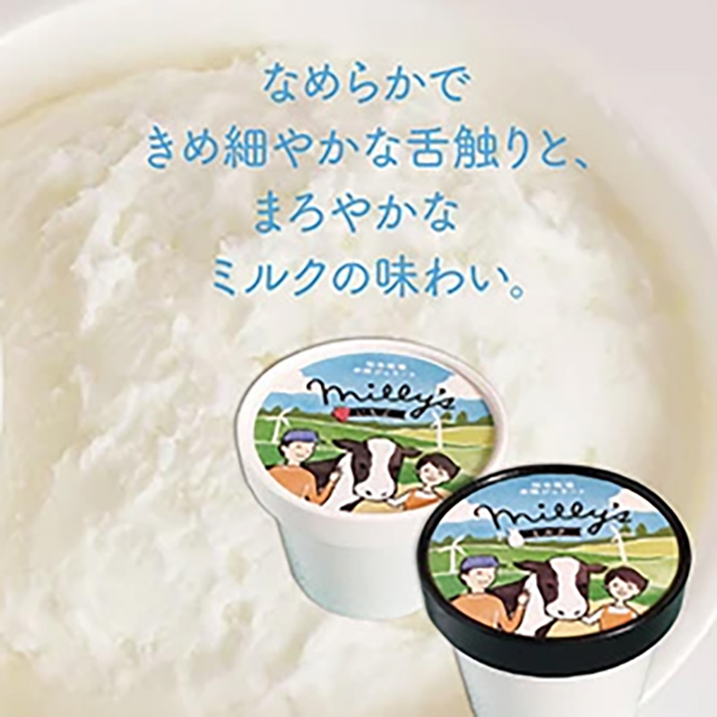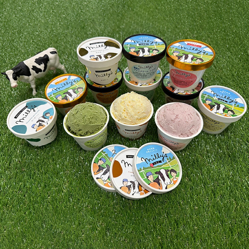 ミリーズ:ミルク、バニラ、いちご、抹茶、チョコレート、黒ごまきなこ、ヨーグルト、みかんシャーベット、いちごシャーベット(各110ml×各1個) |