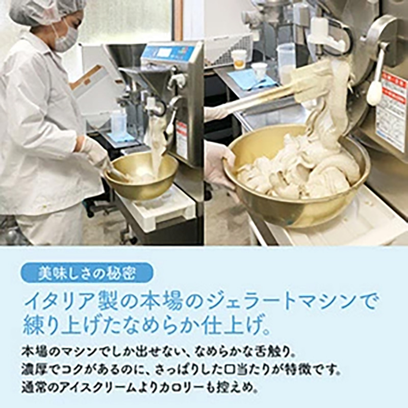 牧場敷地内にある工房の本場イタリア製ジェラートマシン(“アイスマシン界のフェラーリ”とも称されるマシン)で、搾りたて生乳と地元生産者から直接仕入れた新鮮な農産物を使用。