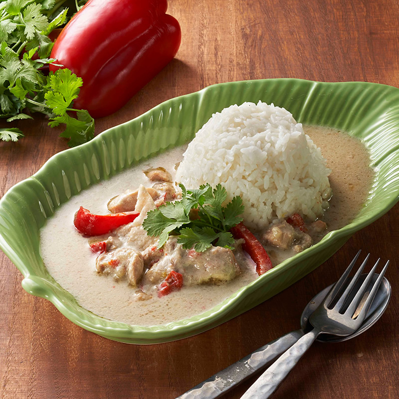 | 原材料 | 【グリーンカレー】 ココナッツミルク(タイ製造)、鶏肉(九州産)、ソテーオニオン、水煮たけのこ、パプリカ、米黒酢、グラニュー糖、カレー調味料(青唐辛子、エシャロット、レモングラス、その他)、魚醤油、コーンスターチ、(一部に鶏肉を含む) 【とうふハンバーグ トマトソース】 ハンバーグ(食肉等(鶏肉(九州産)、鶏脂(九州産)、鶏皮(九州産))、野菜(玉ねぎ、にんじん、枝豆)、牛乳、つなぎ(パン粉、でん粉、粉末状植物性たん白)、豆腐、植物油脂、食塩、チキンエキス、砂糖、香辛料)(国内製造)、トマトピューレ、ソテーオニオン、にんじん、枝豆、砂糖、しょうゆ、コーンスターチ、はちみつ、チキンエキス、食塩、香辛料/調味料(アミノ酸)、(一部に乳成分・小麦・鶏肉・大豆を含む) 【とうふハンバーグ 豆乳クリームソース】 ハンバーグ(食肉等(鶏肉(九州産)、鶏脂(九州産)、鶏皮(九州産))、野菜(玉ねぎ、にんじん、枝豆)、牛乳、つなぎ(パン粉、でん粉、粉末状植物性たん白)、豆腐、植物油脂、食塩、チキンエキス、砂糖、香辛料)(国内製造)、牛乳、豆乳、ソテーオニオン、マッシュルーム、バター、米粉、チキンエキス、食塩、砂糖、ホワイトペッパー、ナツメグ/調味料(アミノ酸)、(一部に乳成分・小麦・鶏肉・大豆を含む) |