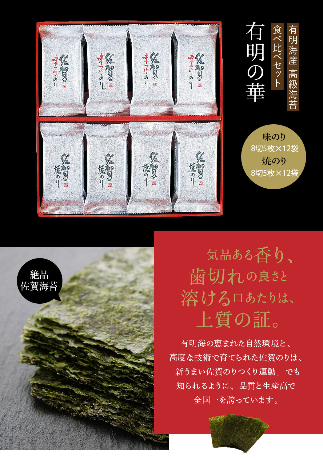 内容量:味のり8切5枚×12袋、焼のり8切5枚×12袋