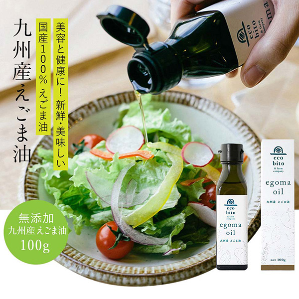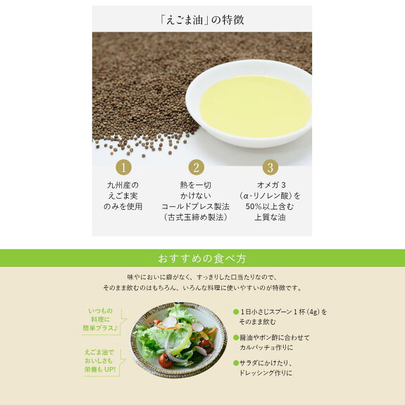 からだにいい栄養がつまった美味しくて、新鮮で、安心なえごまをたくさんの方にお届けしたい。そんな思いから、化学肥料や農薬を使わずに育てたえごまを生搾りにして、国産100%のえごま油をつくりました。保存料や酸化防止剤も一切加えていない、新鮮でおいしい、えごまそのものの味をお届けいたします。<特徴>1.九州産のえごま実のみを使用2.熱を一切かけないコールドプレス製法(古式玉締め製法)3.オメガ3(α‐リノレン酸)を50%以上含む上質な油<おすすめの食べ方>いつもの料理に簡単プラス。えごま油でおいしさも栄養もUP!味やにおいに癖がなく、すっきりした口当たりなので、そのまま飲むのはもちろん、いろんな料理に使いやすいのが特徴です。●1日小さじスプーン1杯(4g)をそのまま飲む●醤油やポン酢に合わせてカルパッチョ作りに●サラダにかけたり、ドレッシング作りに
