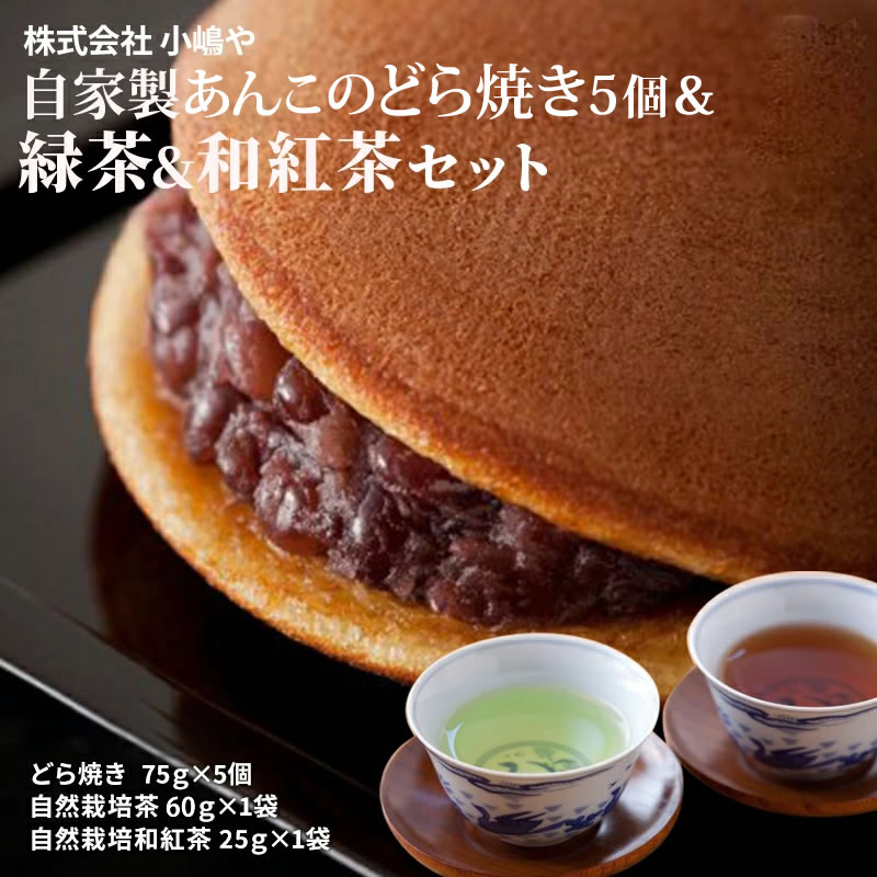 【産直商品】小嶋や 自家製あんこのどら焼き5個&緑茶&和紅茶セット